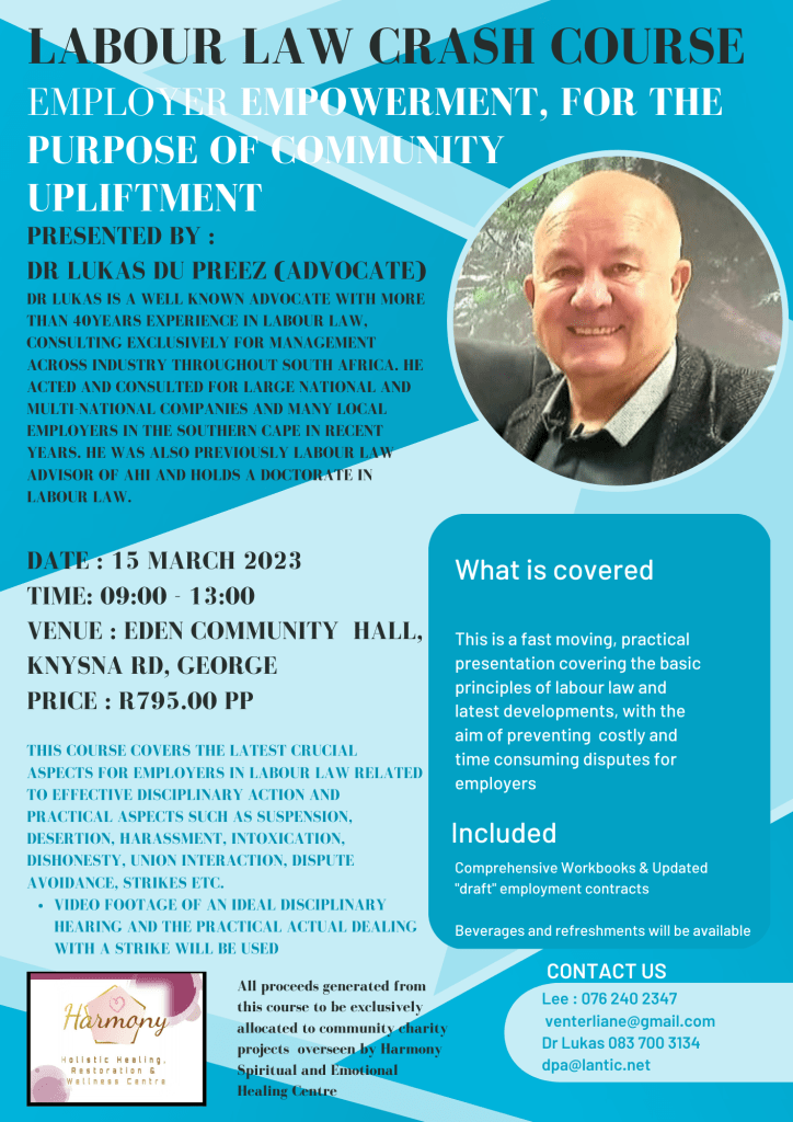 A well structured, comprehensive work book for future reference, draft “employer friendly” employment contracts, both permanent- and fixed term, incorporating the latest legal requirements, are included. Electronic presentations of a simulated actual ideal disciplinary hearing and the legally correct handling by management of an actual strike shall also be presented.
